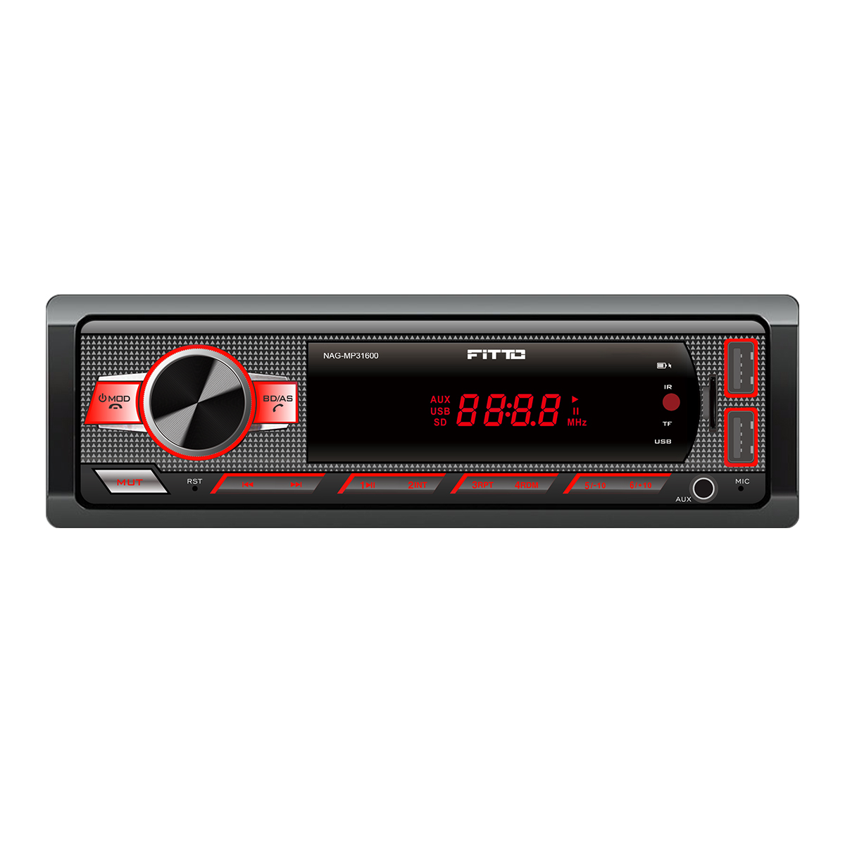 * Entrada AUX frontal, compatível com dispositivos de áudio